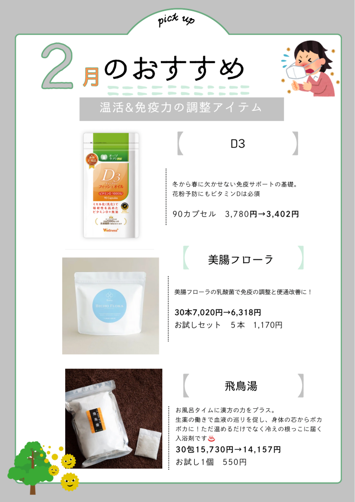 インフルエンザや花粉症、冷えなどが気になる時期ですよね。