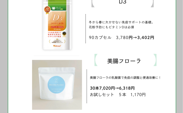 2026年2月1日NEWSprivatesalon_vinaka 2月のオススメアイテム インフルエンザや花粉症、冷えなどが気になる時期ですよね。 腸も免疫と関係します。 冷えも腸の大敵。 ・食事だけでは、栄養が足りない。 ・腸が悪くて、栄養が吸収できていない。 それを少しでも補えるアイテムとしてご用意してお […]